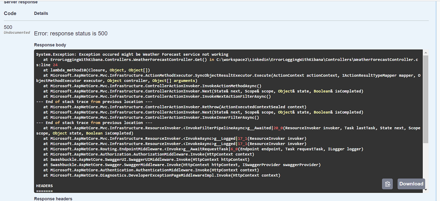 }When you execute the endpoint, it will insert the logs into Kibana through Elasticsearch