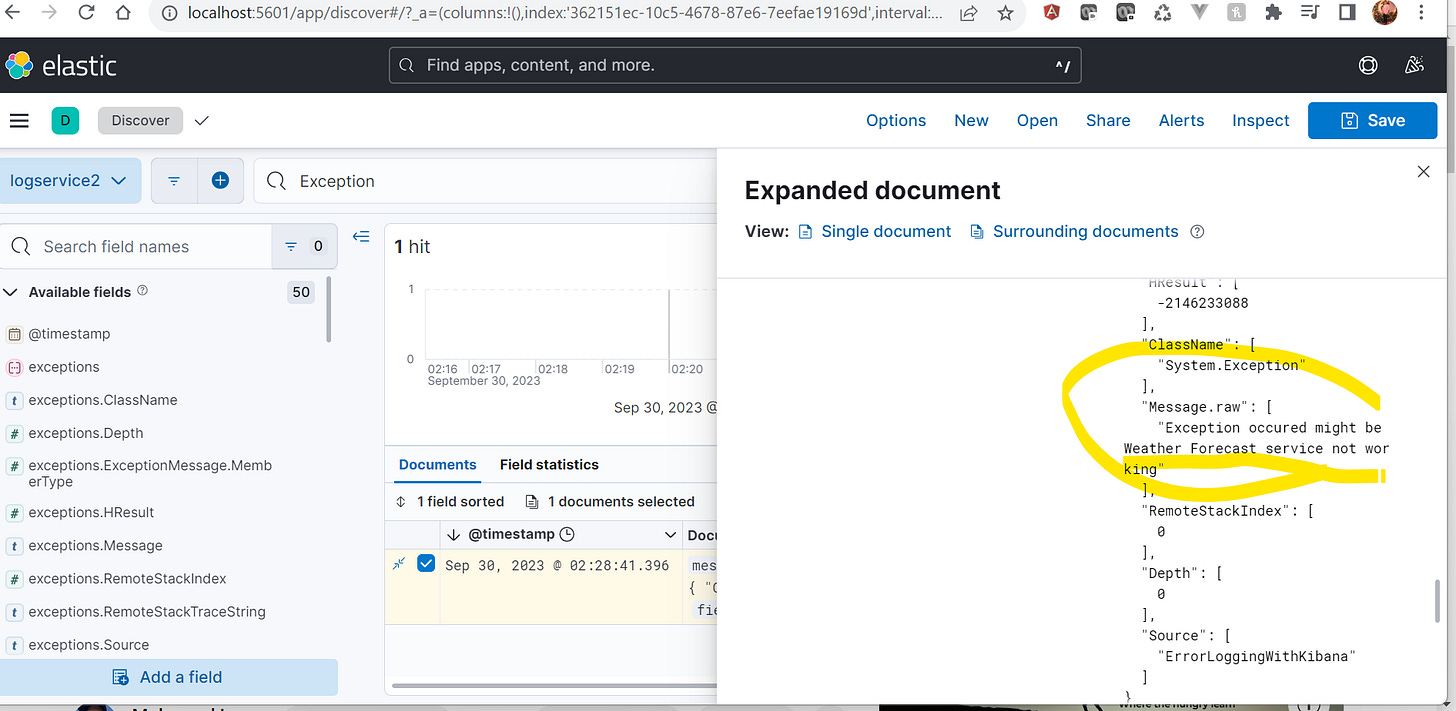 }To verify this in Kibana, please click on the expand icon. The exception is quite lengthy, making it difficult to view the complete log here.